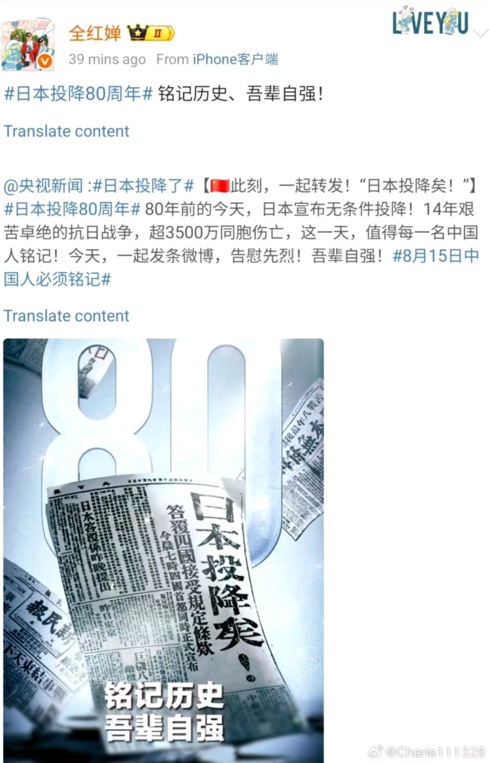 央视官方发文,号召广大网友一起转发“日本投降矣!”无论是运动健儿还是娱乐圈明星,纷纷加入转发的队伍当中。